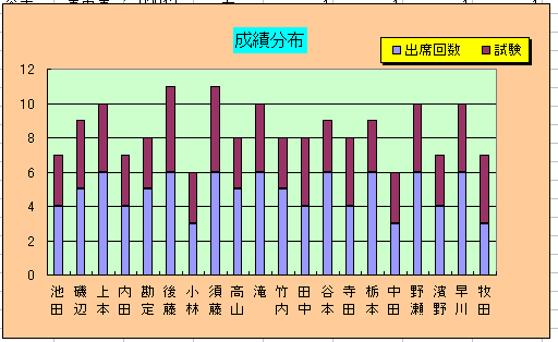 このファイルのシート E3-3 のデータを加工して、 出席回数と、試験の積上グラフを作成せよ。 なお、名前の縦書きは配置で縦文字列を選択すること。