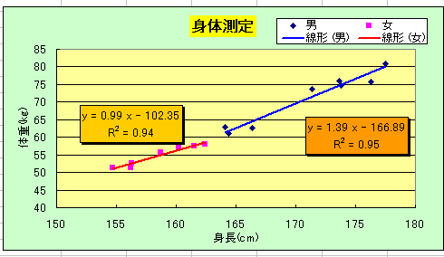 Lesson 3-4で用いた身体測定のデータから 男女別のグラフを作成し、それぞれの回帰直線を求めよ。