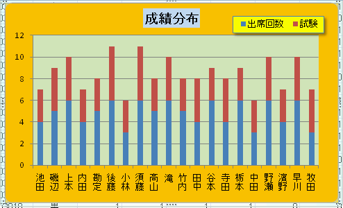 このファイルのシート E3-3 のデータを加工して、 出席回数と、試験の積上グラフを作成せよ。 なお、名前の縦書きは配置で縦書きを選択すること。