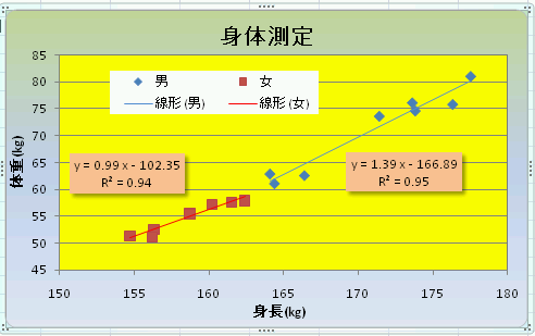 Lesson 3-4で用いた身体測定のデータから 男女別のグラフを作成し、それぞれの回帰直線を求めよ。